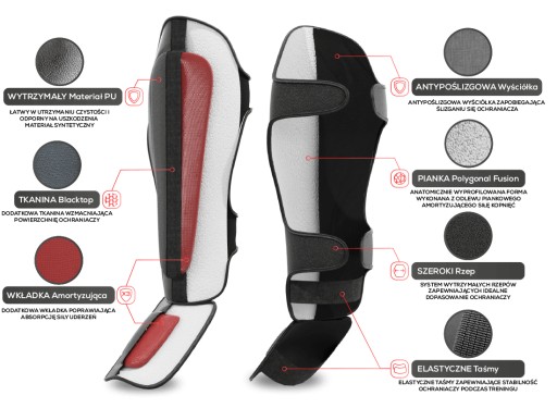 Представлені протектори на гомілки виготовлені зі спеціальної піни високої щільності, завдяки чому протектори легкі, але в той же час відмінно поглинають удари, забезпечуючи комфорт і безпеку під час тренувань. Використовуваний наповнювач стійкий до злипання і деформації, завдяки чому протектори зберігають свої властивості навіть після багатьох років використання.