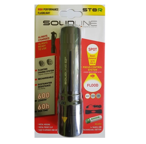 Модель Ledlenser Solidline ST8R - Ліхтарик ST8R є флагманом серії Solidline. Всі ліхтарики цієї серії виготовлені з високоякісного алюмінієвого сплаву, стійкого до сильних ударів і сильного дощу. Акумуляторний, дуже потужний ліхтарик, діод якого живиться від потужної літій-іонної батареї 18650, що забезпечує 3 потужні рівні освітлення, заряджається через зручну систему Micro Port USB з магнітним наконечником. Під час зарядки ліхтарик завжди готовий до використання, додаткова ручка дозволяє його постійно кріпити до стіни, тому він завжди готовий до негайного використання. Великою перевагою моделі є можливість змінювати фокусну відстань світла.