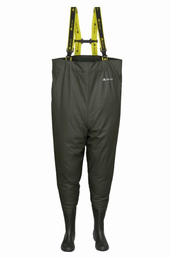 Вейдерси з високоякісного поліестерового матеріалу. Сучасна технологія шовного зварювання гарантує 100% водонепроникність і високу стійкість до пошкоджень. Калоші оснащені підошвою з протектором, що гарантує високу стійкість