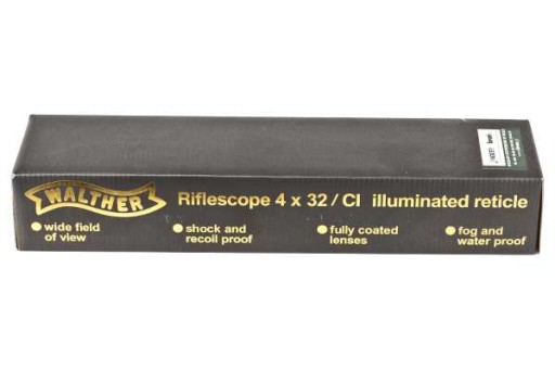 Конструкція також є ударостійкою, тому приціл Walther 4×32 IR також можна використовувати на пружинних пневматичних гвинтівках високої енергії.
