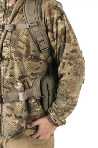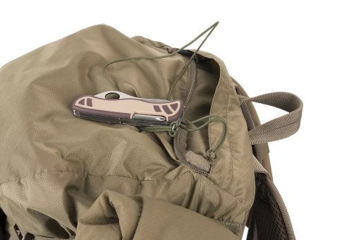 Кожна зовнішня кишеня, окрім клапана з пряжкою, має власний димохід, який при витягуванні захищає вміст від втрати. Кишені вшиті. Завдяки цьому він може носити за ними, наприклад, сокиру. В основному клапані є дві великі кишені для зручностей. Кишеня з внутрішньої сторони клапана сітчаста, закривається на блискавку. Клапан закривається на дві пряжки. Додаткові кишені в системі MOLLE/PALS можна прикріпити до рюкзака в декількох різних місцях; з боків, спереду та посередині на спеціальній панелі. З боків рюкзака вшиті дві компресійні лямки, на які також можна прикріпити, наприклад, спальний килимок. На дні рюкзака є стрічки, які також можна використовувати для цієї мети. Щоб зменшити вагу конструкції, ми використали поєднання матеріалу Cordura® 500D з нейлоном 210D. Ця комбінація також гарантує міцність у ключових місцях. Система перенесення заснована на пластиковій жорсткій спинці з дихаючими сітчастими накладками та анатомічно профільованими плечовими лямками. У комплект входить відстібний широкий пояс з осередками PALS.