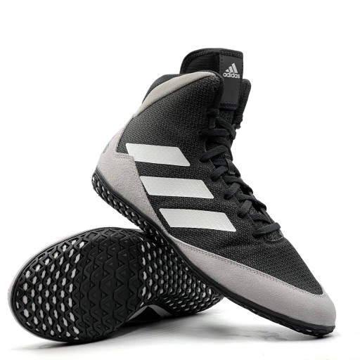 Adidas представляє нове покоління перевіреної моделі Adidas Mat Wizard! Покращений верх набагато жорсткіший, забезпечуючи ще кращу стабілізацію гомілковостопного суглоба. Пластикові панелі замінено на замшу та високоякісний жорсткий сітчастий матеріал. Гумова підошва забезпечує надзвичайне зчеплення з килимком під будь-яким кутом. Атакуйте швидко, не турбуючись про втрату стійкості під час динамічних рухів, завдяки надійному Mat Wizard 5!