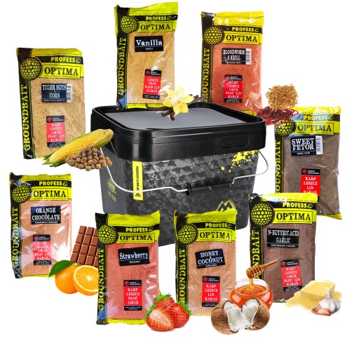 - Прикормка Optima 1 кг зі смаками: ПОЛУНИЦЯ, ВАНІЛЬ, МЕД і КОКОС, ОЧОТКА і КРИЛО, СОЛОДКИЙ ФЕТОР, АПЕЛЬСИН і ШОКОЛАД, ТИГРОВИЙ ГОРІХ і КУКУРУДЗА, МАСЛЯНА КИСЛОТА і ЧАСНИК
