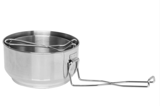 Каструля з трьох частин, до складу якої входять: дві ємності ємністю 1 л (діаметр 15 см) і 0,7 л (діаметр 13 см), які можна поставити одна в одну, і кришка діаметром 15,5 см, яка може використовувати як сковорідку. Вся справа виготовлена з електрополірованої нержавіючої сталі, товщина якої дозволяє готувати прямо на вогні, без ризику обпалити посуд.
