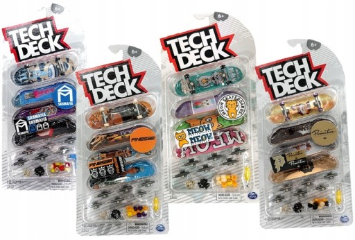 Tech Deck — це справжня насолода з автентичними 96-мм грифами від справжніх скейтборд-виробників! Кожна дошка містить оригінальну графіку від найбільших світових скейтборд-компаній, зокрема Blind, Baker, Primitive, Finesse, Santa Cruz, Plan B, Sk8mafia та Toy Machine. Цей пакет із 4 комплектів містить автентичну графіку, яку ви можете розташувати як завгодно. Створюйте свої улюблені макети ліній і розвивайте свої хитрощі, перевіряючи підказки на techdeck.com. Порівняйте свою колекцію онлайн за допомогою інтерактивних інструментів колекції Tech Deck. Є багато дощок для збору! Якщо вам потрібні дивовижні деталі ковзанів від справжніх скейт-компаній, це має бути Tech Deck! Збери всі дошки!