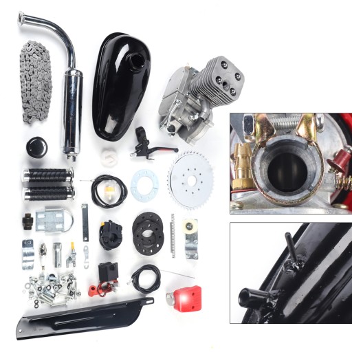 - Набір двигуна для велосипеда 100CC включає всі деталі та аксесуари, необхідні для перетворення вашого звичайного велосипеда на мотоцикл з бензиновим двигуном.