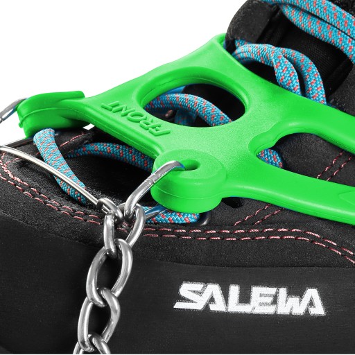 9 передніх зубів міцно захоплюють землю, запобігаючи ковзанню пальців навіть на сильно утрамбованому снігу або мерзлій землі. Це дуже хороший захист від падінь вперед, викликаних «втечею» передньої частини стопи.