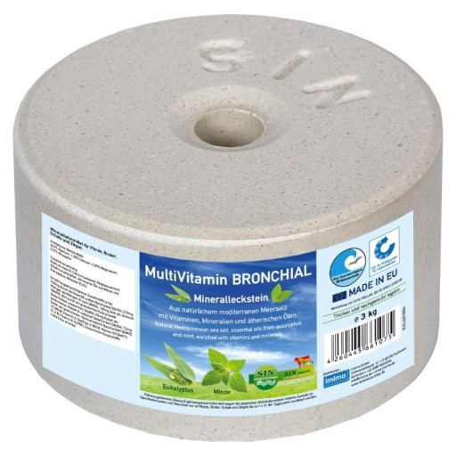 Мультивітамінний льодяник з натуральними ефірними оліями м'яти та евкаліпта містить мінерали, мікроелементи та вітаміни. Він збагачений натуральними ефірними оліями м'яти та евкаліпта для заспокоєння та зменшення симптомів респіраторних захворювань. Особливо в холодну та вологу погоду багато тварин страждають від респіраторних захворювань і мають ослаблений імунітет. Спеціальна рецептура лизату в поєднанні з натуральними ефірними оліями м’яти та евкаліпта допомагає позбутися мокротиння та надає заспокійливу дію при запальних процесах дихальної системи. Багата комбінація мінералів, мікроелементів і вітамінів зміцнює імунну систему. Лизання підтримує дихальну систему та покращує самопочуття тварин природним шляхом. Ліжек виготовлений на основі харчової солі Середземного моря з натуральним йодом.