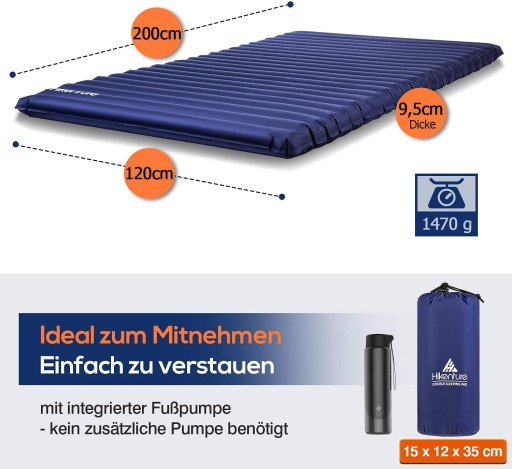 Компактний і надлегкий: порівняно з самонадувними килимками ISO наш двоспальний матрац вагою лише 1470 г набагато легший. Невеликий розмір упаковки 35 х 15 х 15 см економить місце під час зберігання та транспортування. Ідеально брати з собою. Розміри в здутому вигляді: 200 х 120 х 9,5 см