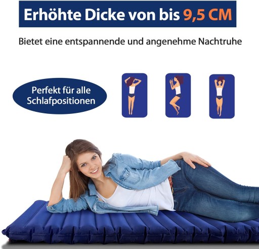 - Надзвичайно зручний: наш надувний матрац товщиною 9,5 см у надутому стані та надзвичайно зручною поверхнею забезпечує чудовий комфорт і чудову теплоізоляцію для двох осіб. Для ваших солодких снів під час подорожі.
