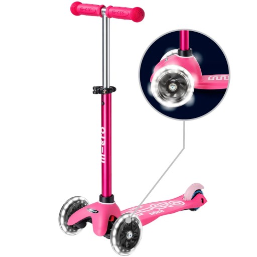 Самокат Mini Micro Deluxe в LED-версії має підсвічування передніх коліс. Світлодіоди, вбудовані в колеса, світяться під час їзди на скутері, створюючи надзвичайний ефект, який робить скутер ще більш привабливим. Цей ефект не тільки забезпечує додаткове задоволення, але й робить дитину більш помітною під час катання на самокаті, що означає більшу безпеку. Завдяки використанню індукції немає необхідності турбуватися про батарею, оскільки діоди отримують енергію від обертових коліс.