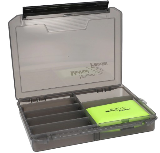 Якісна коробка з засувкою, присвячена техніці метод фідер. Призначений для розміщення годівниць, формочки та розтяжки гумки. У набір входить коробка меншого розміру для всіх дрібних аксесуарів - конекторів, стопорів або запасних гумок.