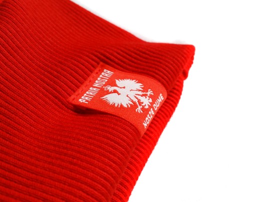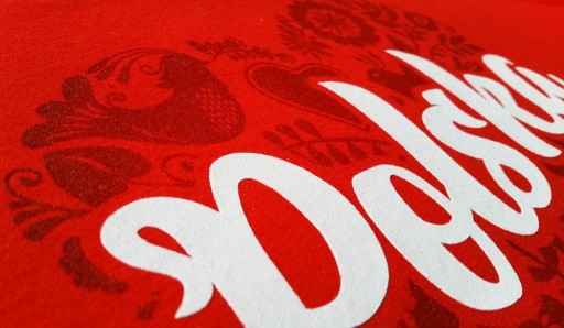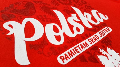 Інтенсивний червоний колір матеріалу в поєднанні з білим домінуючим написом: Polska, виконаним стильним, але водночас розбірливим шрифтом, є ідеальною пропозицією для кожного патріота. Нижче багатозначне гасло «Я пам’ятаю, звідки я», яке нагадує нам, що гордість і національне почуття не залежать від того, де ми живемо. Ми також тонко позначаємо близький нам символ коронованого орла, прикрашений каліграфічним написом зі слоганом нашої компанії: «Я ношу гордість». спосіб друку. Для найкращого відтворення та інтенсивності білого кольору нанесено 2 шари фарби. Тло візерунка – це суміш елементів, які переважно символізують народний характер, притаманний польській ідентичності. Виготовлені бордовою фарбою, вони оформлені у формі серця, зі смаком вписуючись у колір матеріалу та додатково підкреслюючи любов до Батьківщини.