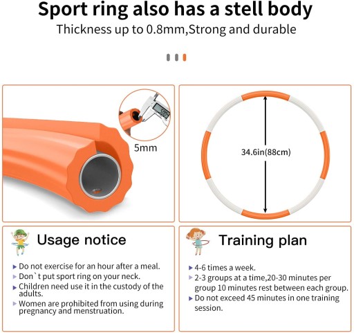Конструкція з можливістю регулювання ваги: внутрішня труба хула-хупа з нержавіючої сталі порожниста, тому ви можете додати зерна або сталеві кульки, щоб відрегулювати вагу 1,2–3,2 кг, що робить його більш складним і збільшує вагу інтенсивності тренувань, допомагає в різних тренуваннях фази та люди будь-якого рівня кваліфікації. Він задовольнить потреби новачків і людей, які хочуть професійно тренуватися.