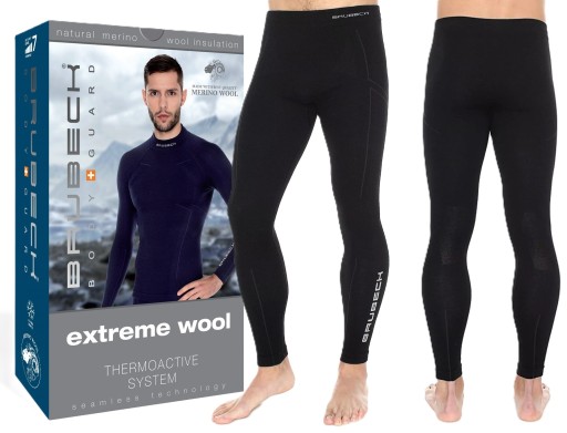Чоловічі термоактивні вовняні термолосини BRUBECK EXTREME WOOL / LE11120 з довгими штанинами виготовлені за безшовною технологією з двошарового дихаючого щільного трикотажу. Для внутрішнього шару використовується поліамідна пряжа, а для зовнішнього – 100% вовняне трикотажне полотно, отримане з найякісніших волокон мериносової овечої вовни. Переваги легінсів особливо оцінять активні люди, які шукають універсальний виріб для мінливих погодних умов. Двошарова конструкція забезпечує унікальні терморегуляційні властивості, які захистять тіло від охолодження та перегріву. Поліамідний шар швидко і ефективно відведе вологу, а зовнішній вовняний шар захистить від втрати тепла. Шерсть має здатність «вбирати» вологу до 35% своєї ваги, але не залишає ефекту мокрого «холодного» одягу. Завдяки ланоліну волога не проникає всередину волоса, а тільки в канали між окремими волосками. Тому він дуже швидко випаровується, що призводить до ефекту сухості шкіри. Завдяки високій еластичності вовни легінси не змінюють своєї форми і ідеально прилягають до тіла.