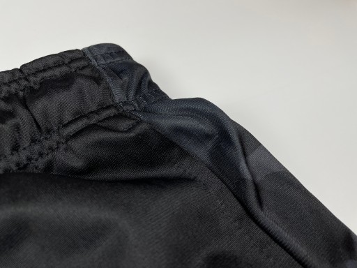 Штани класичні чорні. Мають тканинні вставки з сіро-чорним малюнком з боків. Брюки мають прямі штанини, трохи завужені донизу. Мають гумку і додаткову зав'язку на талії, що сприятиме кращій посадці по фігурі. Штани виготовлені зі слизького матеріалу. Склад матеріалу - 100% поліестер. На лівій ніжці вони мають ретельно вишитий сірий логотип бренду. На брюках є незначні сліди використання.