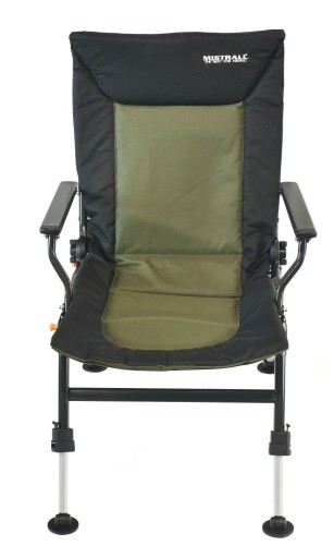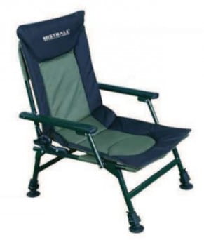 Рибальський стілець зі спинкою Mistrall. Зручне крісло для рибалок, які цінують комфорт під час риболовлі, оснащене плавним регулюванням сидіння, якісним дихаючим матеріалом, порошковим покриттям, алюмінієвими підлокітниками. Він легко розкладається, має телескопічні, висувні та регульовані ніжки, оснащені кронштейнами, які запобігають просіданню крісла в землю. Регульовані ніжки дозволяють пристосувати крісло до нерівності місцевості кожного місця риболовлі. Всередині матеріалу вшита м'яка губка, що робить крісло дуже комфортним. Є можливість розкласти крісло до повністю лежачого положення.