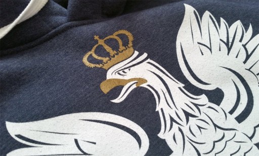 Друк на лицьовій стороні виконано змішаними методами трафаретного друку. Щоб додатково підкреслити гордість польського білого орлана, ми використали золоту фарбу (глітер), що надає ефект блиску. Для найкращого відтворення та інтенсивності білого кольору ми вирішили нанести 2 шари фарби.