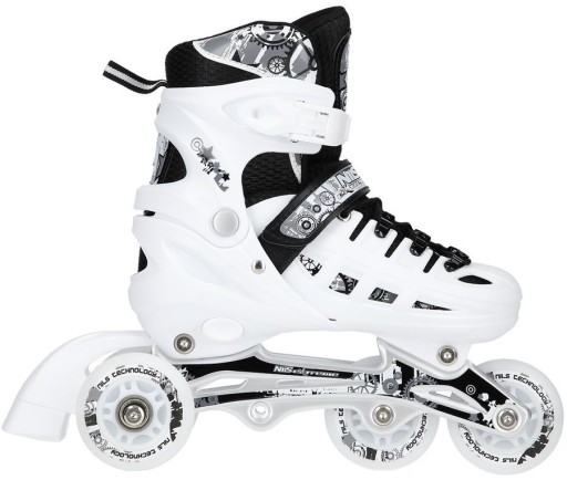 Роликові ковзани NH10905 - це справжнє задоволення від катання. Завдяки можливості перенесення додаткового колеса на задню вісь, роликовий ковзан функціонально перетворюється на роликовий ковзан. Таке рішення допоможе самим маленьким фігуристам зробити перші кроки в цьому виді спорту. У свою чергу, установка додаткового колеса на передню вісь перетворює виріб на роликовий ковзан. Ролик оснащений спеціальним алюмінієвим полозом і гальмом, що забезпечує безпеку під час їзди. У свою чергу, колеса та підшипники класу ABEC7 дозволяють знизити опір коченню, тобто швидше їздити.