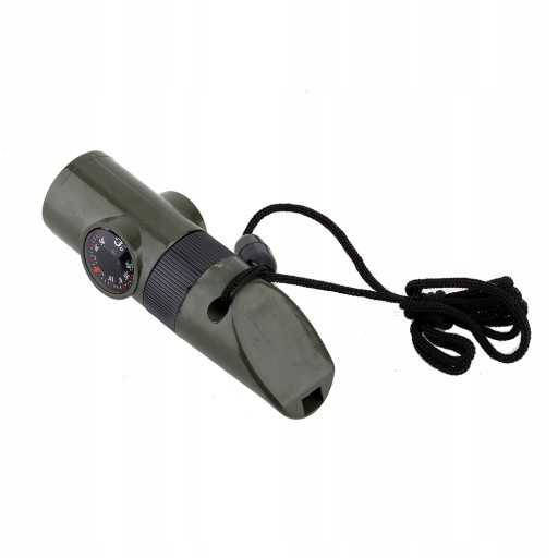 Набір свистків 7 в 1: свисток, компас, термометр, світлодіодний ліхтарик, збільшувальне скло, сигнальне дзеркало та невеликий контейнер.