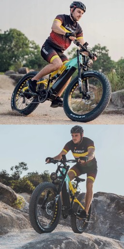 Підвіска з подвійною масляною пружиною та передня вилка з можливістю блокування використовуються, щоб забезпечити водієві більший комфорт під час зіткнень. Великі нерівності та брудні дороги з діаметром колеса 26*4,0 дюймів легко проходять крізь лежачі поліцейські. Шина має ширину до 10 см, має функції протиковзання та антивібрації, а також має більший проліт. Більше, швидше та менше зусиль.