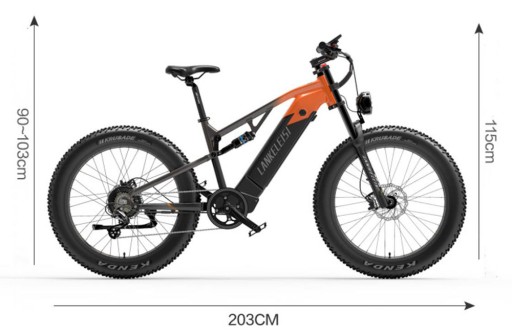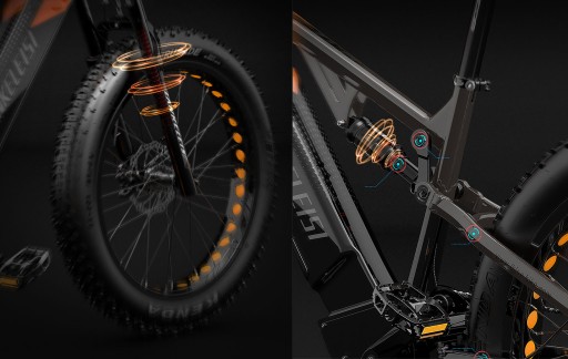 Підвіска з подвійною масляною пружиною та передня вилка з можливістю блокування використовуються, щоб забезпечити водієві більший комфорт під час зіткнень. Великі нерівності та брудні дороги з діаметром колеса 26*4,0 дюймів легко проходять крізь лежачі поліцейські. Шина має ширину до 10 см, має функції проти ковзання та антивібрації, а також має більший проліт. Більше, швидше та менше зусиль.