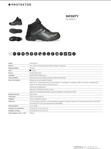 - Підошва: pu/pu (технологія PRT FLEX, технологія SHOCK ABSORBER, кислотостійка підошва, лугостійка підошва, стійкість до короткочасного контакту з температурою 180°C)
