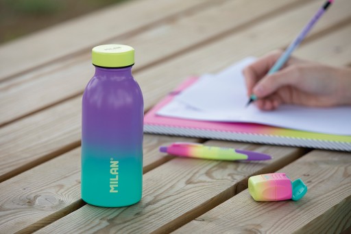 Термопляшка з колекції SUNSET маленька фіолетово-зелена з жовтою кришкою.
