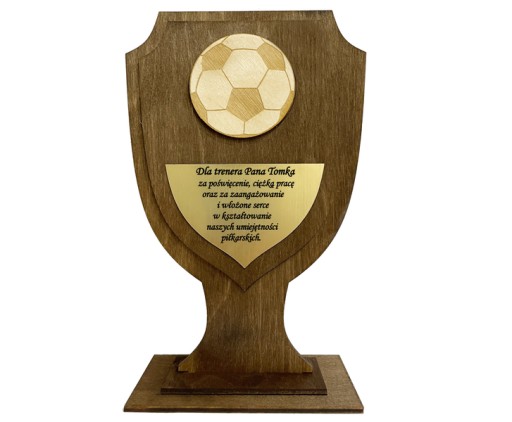 Статуетка виготовлена з двох шматочків дерева (фанера 3мм), коричневого кольору (+ як третій шар куля склеєна). На статуетку приклеюється пластина з будь-яким ГРАВІЮВАННЯМ. Тарілки з гравірувального ламінату, два кольори на вибір: срібло та золото.