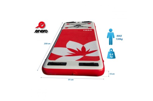 НАДУВНА ДОШКА ДЛЯ ЙОГИ ENERO - ідеальний вибір, якщо ви любите різноманітні спортивні виклики. Прямокутна, дуже широка форма, неслизька поверхня та великі ручки ідеально розроблені для безпечної зміни положення під час вправ, наприклад, йоги, пілатесу або фітнесу на воді!