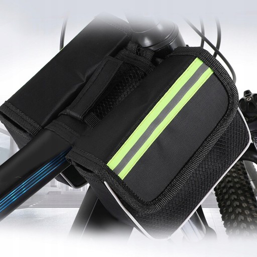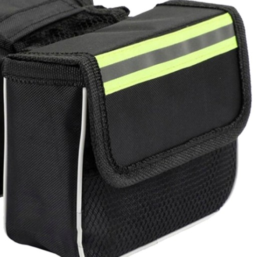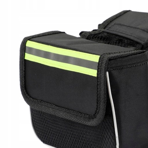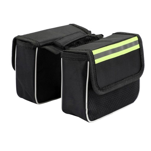 Велосипедна сумка з розмірами: ширина 5,5 см, довжина 15 см, висота 12 см. Має два відділення, які застібаються на липучки. У кожному відділенні зовні є додаткова сітчаста кишеня, яка полегшує швидке витягування речі. Сумка стане в нагоді для транспортування телефону, гаманця, ключів, інструментів для ремонту, напоїв та інших дрібниць тощо.