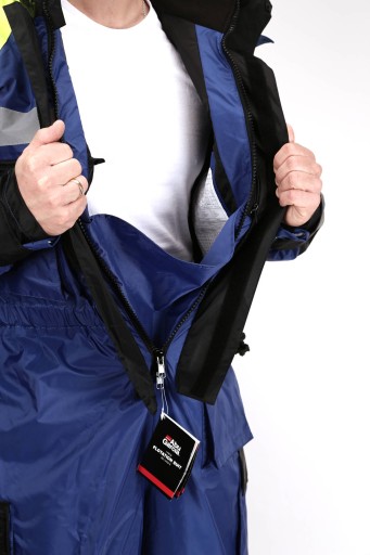 Водонепроникний і вітронепроникний рятувальний костюм, покритий зовні оксфордським нейлоном 420 день. Шви обтягнуті стрічкою з водонепроникною ПВХ мембраною з внутрішньої сторони. Для комфорту комір і кишені обшиті флісом. Щоб захистити обличчя від вітру, можна стягнути капюшон за допомогою шнурка. Світловідбивачі на ногах, руках і голові. Світловідбиваючий жовтий матеріал на плечах і кишенях покращує видимість у темряві. Поставляється в практичній вітрильній сумці. Схвалено відповідно до CE-EN393.