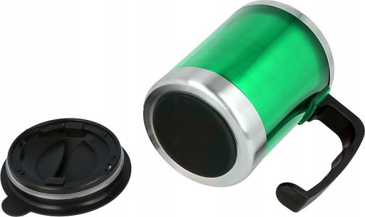 Термокружка, зверху закрита кришкою, внутрішня частина виготовлена з нержавіючої сталі.