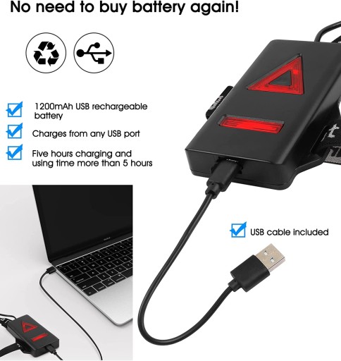 USB Rechargeable: нагрудна лампа USB, що перезаряджається, сумісна з будь-яким USB-портом, таким як зарядний пристрій, блок живлення, комп’ютер тощо. Термін служби становить більше 5 годин у низькому режимі, який базується на потужному акумуляторі 1800 мАг.