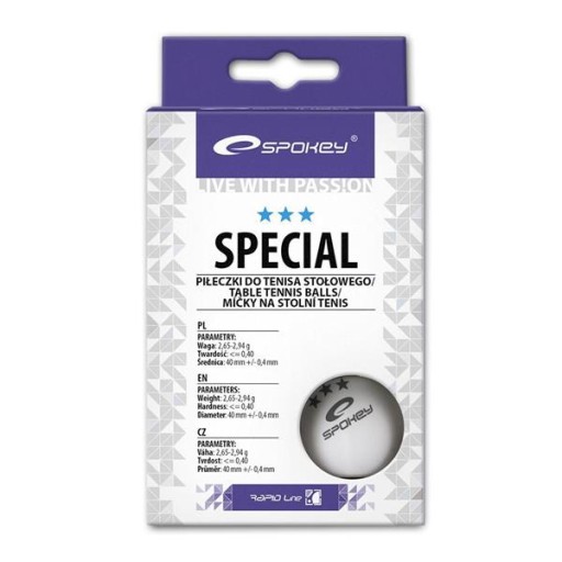 М'ЯЧІ ДЛЯ НАСТІЛЬНОГО ТЕНІСУ SPOKEY - SPECIAL WHITE. ТЕХНОЛОГІЯ: Кулі виготовлені за безшовною технологією, тому ніщо не порушує їхню форму. Відповідний баланс робить м'ячі ідеальними для швидких ігор з високим обертом. ПРИЗНАЧЕННЯ: Для розважальних ігор на просунутому рівні. Параметри: Вага: 2,65-2,94 г Твердість: 0,40 мм Діаметр: 40 мм (+/- 0,4 мм) Набір: 6 шт.