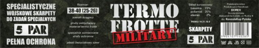 ПОЛЬСЬКІ ДУЖЕ ТУСТІ та міцні ВІЙСЬКОВІ ШКАПЕТКИ FROTTE. Теплі товсті зимові шкарпетки, посилені на носках і п'ятах із захисними зонами і плоским швом без тиску. Завдяки цьому шкарпетки можна використовувати як військові шкарпетки, махрові робочі гігієнічні шкарпетки, шкарпетки для походів і спеціальних завдань. Супер міцний носок, добре вбирає піт.