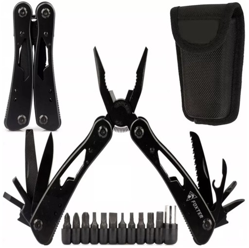 Багатофункціональний інструмент виготовлений з міцної нержавіючої сталі, пофарбованої в чорний колір. У комплекті: