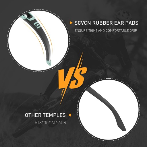 【ДОВГІ ГУМОВІ ВСТАВКИ】Велосипедні окуляри SCVCN виготовлені з міцної та гнучкої оправи TR90. Довші гумові вставки можуть зменшити біль, спричинений тиском на вуха, і забезпечити зручне захоплення під час їзди на велосипеді.