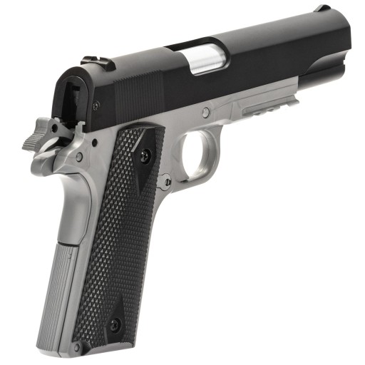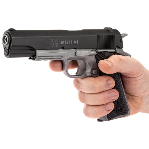Пружинна копія пістолета Colt 1911A1, виготовлена переважно з міцного пластику. Замок і дрібні елементи виготовлені з металу, що збільшує вагу репліки і створює враження автентичності. На рушницю нанесено оригінальне маркування Colt.