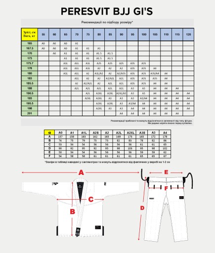 10 розмірів кімоно, що забезпечують оптимальну посадку на будь-якій фігурі, в тому числі розміри з буквою L довше стандартних моделей, буквою S - коротше, для спортсменів з коротшою, але товстою кісткою.