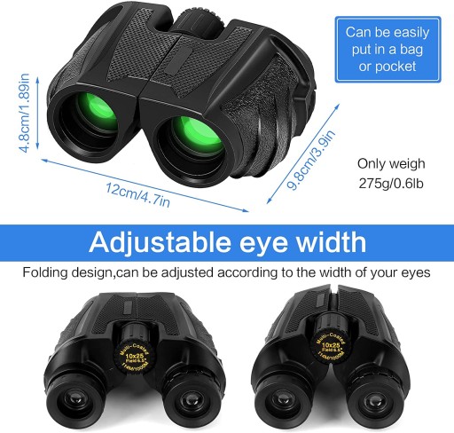 - 【HD і яскраве поле зору】Наш компактний бінокль має призму BAK4, зелену лінзу об’єктива FCM і окуляр із синім покриттям FMC. Має хорошу світлопроникність і забезпечує більш яскраве і чітке зображення. Його також можна використовувати вночі, якщо є лише тьмяне світло.