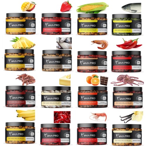 Смаки: манго, полуниця, кукурудза, білий амур, ананас, риба, креветки, чилі, червоний хробак, масляна кислота, апельсин - чокок, восьминіг - кальмар, банан, мотиль, кріль, ваніль
