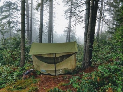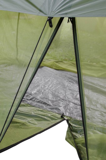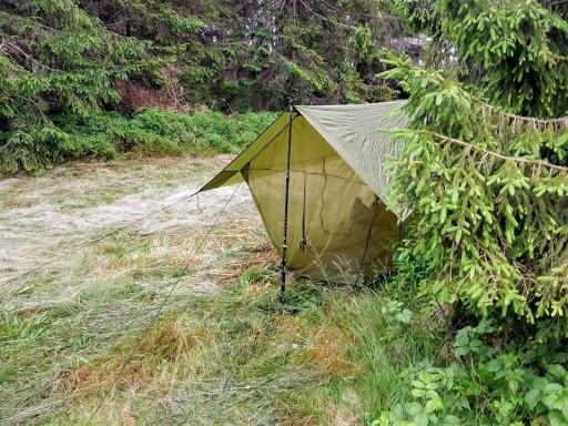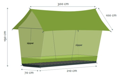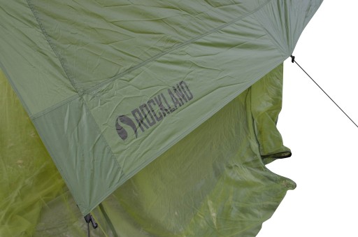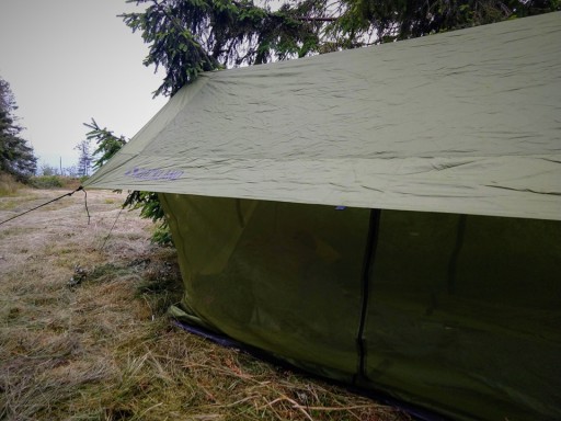 Ширина брезенту/верхнього простирадла не така широка, як стандартні брезенти, але в поєднанні з відповідним матеріалом протимоскітної сітки забезпечує захист навіть від проливного дощу. У виняткових ситуаціях цей намет може дати притулок двом/трьом людям - одна людина в гамаку, інші сплять під ним, на підлозі. Флайшет виготовлена з ріп-стоп поліестеру з характерною структурою на поверхні, що забезпечує відповідну довговічність. Він також покритий поліуретановим покриттям, що робить його водонепроникним до 3000 мм. Завдяки водонепроникній поліетиленовій підлозі ваш багаж буде надійно захищений від намокання. Бічні стінки виготовлені з надлегкої нейлонової сітки 20D, що підвищує комфорт перебування в наметі в спекотні дні.