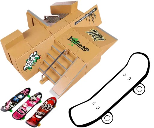 Набір складається з 3 грифів і конструкції, що нагадує скейт-парк. Завдяки 8 різним, відповідним модулям, які включають сходи, поручень або стрибок, ми можемо грати на різних конфігураціях пандусів. Це дозволить виконати найпривабливішу акробатику.