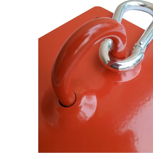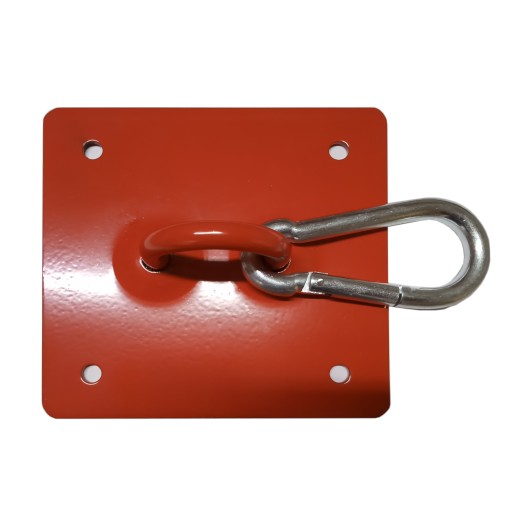Ідеальний тримач для підвішування боксерської груші підвищеної міцності до 100 кг. Кріпиться до стелі або стіни за допомогою чотирьох розширювальних дюбелів. Основа виготовлена з листової пресованої сталі товщиною 3 мм. Вухо виготовляється зі сталевого прута діаметром 10 мм. У комплект входить карабін φ10х100 мм. Вся штука покрита порошковою фарбою червоного кольору.