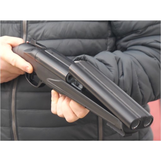 ✅ Так само, як і в двотрубній мисливській рушниці, кулі заряджаються безпосередньо в стволи, після «розриву рушниці» спереду, для чого потрібно лише натиснути згадану кнопку на прикладі.