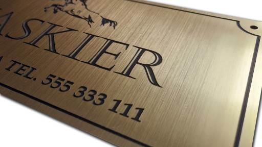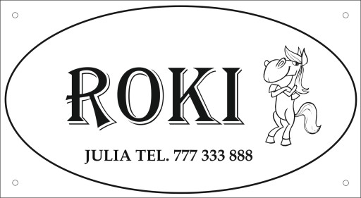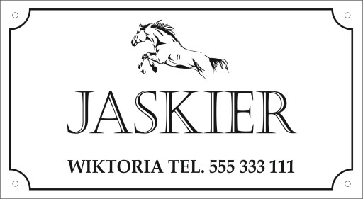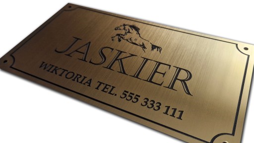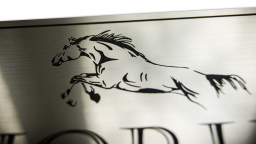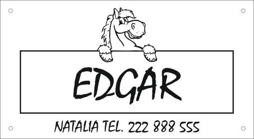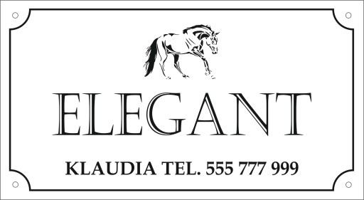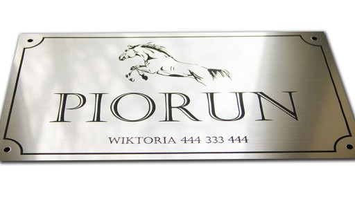 Табличка для стійла для коней, виготовлена з гравірованого ламінату в техніці лазерного гравіювання з матового срібла або матового золота з чорним гравіюванням. Розмір таблички 20х11 см. Табличка має зображення коня, ім'я коня та ім'я та номер телефону власника.