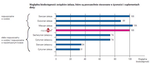В організмі людини залізо всмоктується переважно в тонкій кишці. Водорозчинні сполуки заліза характеризуються хорошою біодоступністю, але несуть ризик швидкого розчинення в шлунку та його побічних ефектів. Залізо у формі Microferr® всмоктується лише в просвіті кишечника, обмежуючи побічні ефекти.