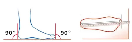 Щоб правильно виміряти довжину стопи, сядьте на стілець, розставивши коліна під прямим кутом. (не робіть це стоячи, присідаючи або в будь-якому іншому положенні). Стопа повинна вільно спиратися на підлогу. Покладіть ногу на аркуш паперу та обведіть початок і кінець стопи, потім виміряйте лінійкою (як на малюнку).