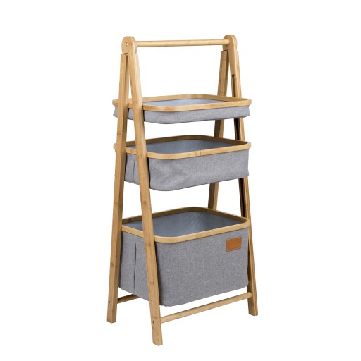 Міцна розкладна шафа. Виготовлений з бамбука, легко збирається завдяки петлям. Має 3 кошики різного розміру з елегантного матеріалу - поліестеру Оксфорд з натуральним виглядом льону. Він надзвичайно універсальний, ідеально підходить для намету або кемпінгу, але він також підійде для домашнього використання в якості полиці для купальних засобів, косметики або іграшок.